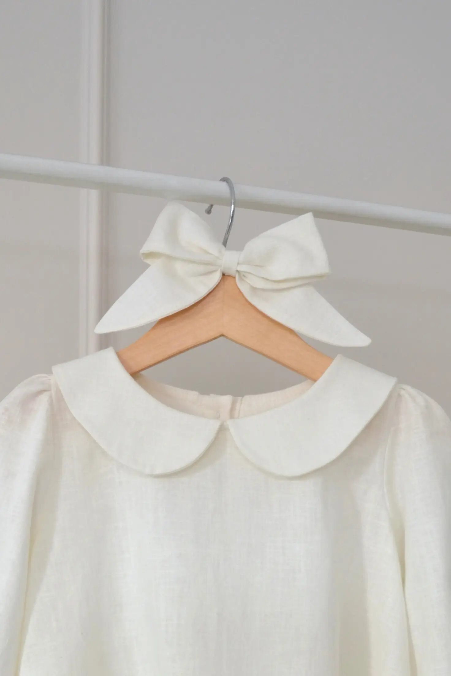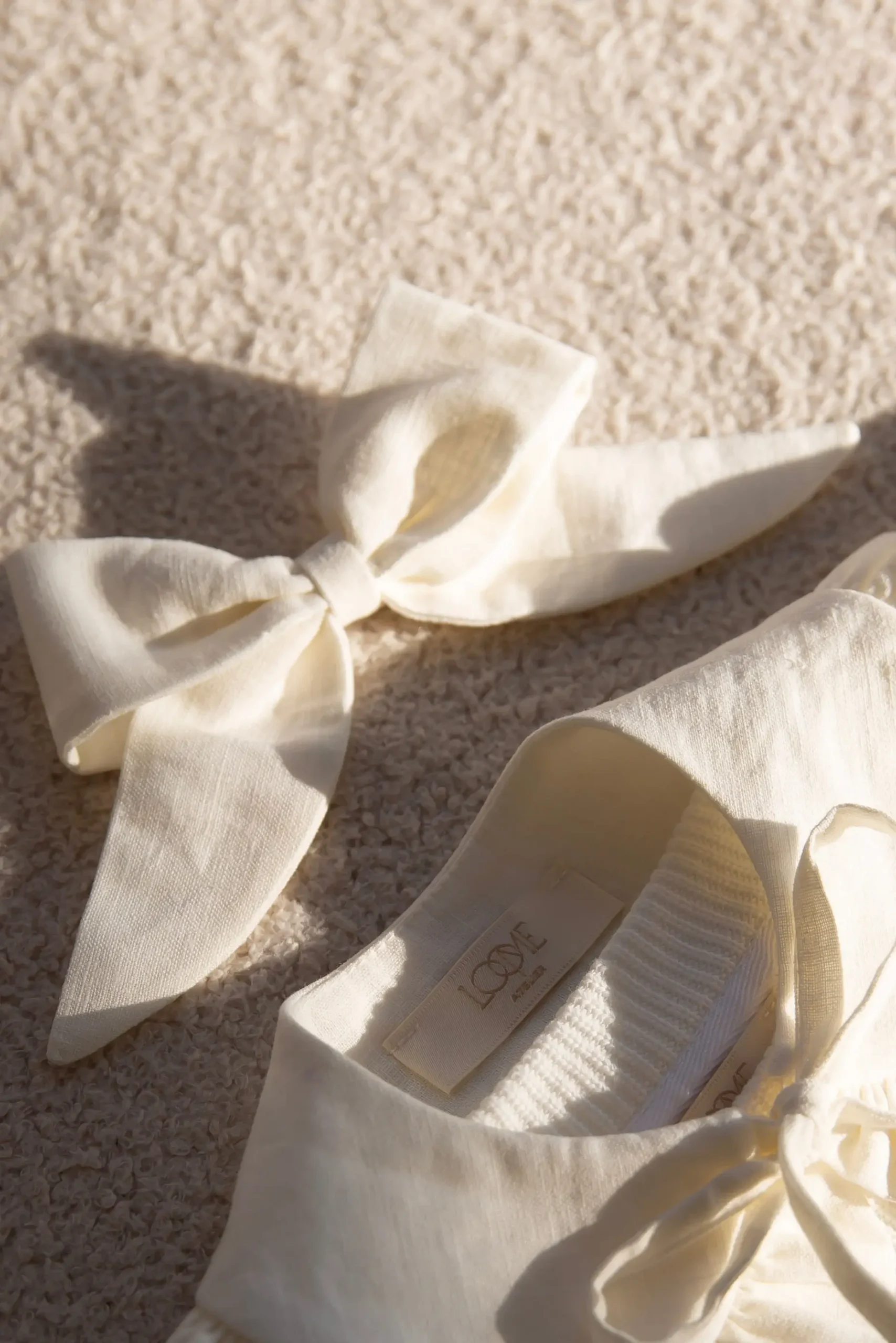 Lniana kokarda w kolorze ecru. Idealny detal do dziewczęcej stylizacji. Kokarda może pełnić rolę spinki, opaski lub gumki do włosów. Świetnie komponuje się z sukienką, sweterkiem, jak i bluzą z naszej kolekcji „Softly”.