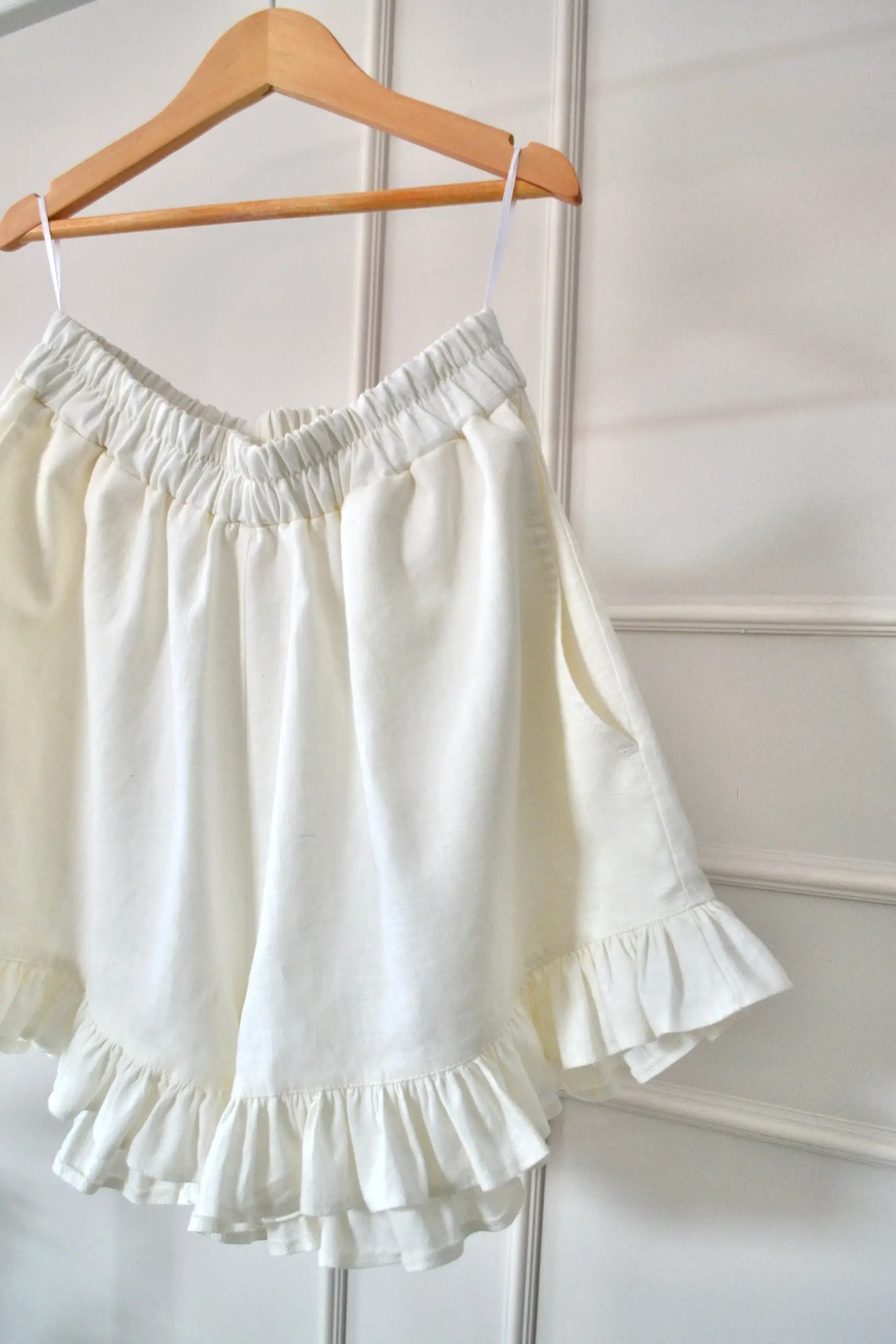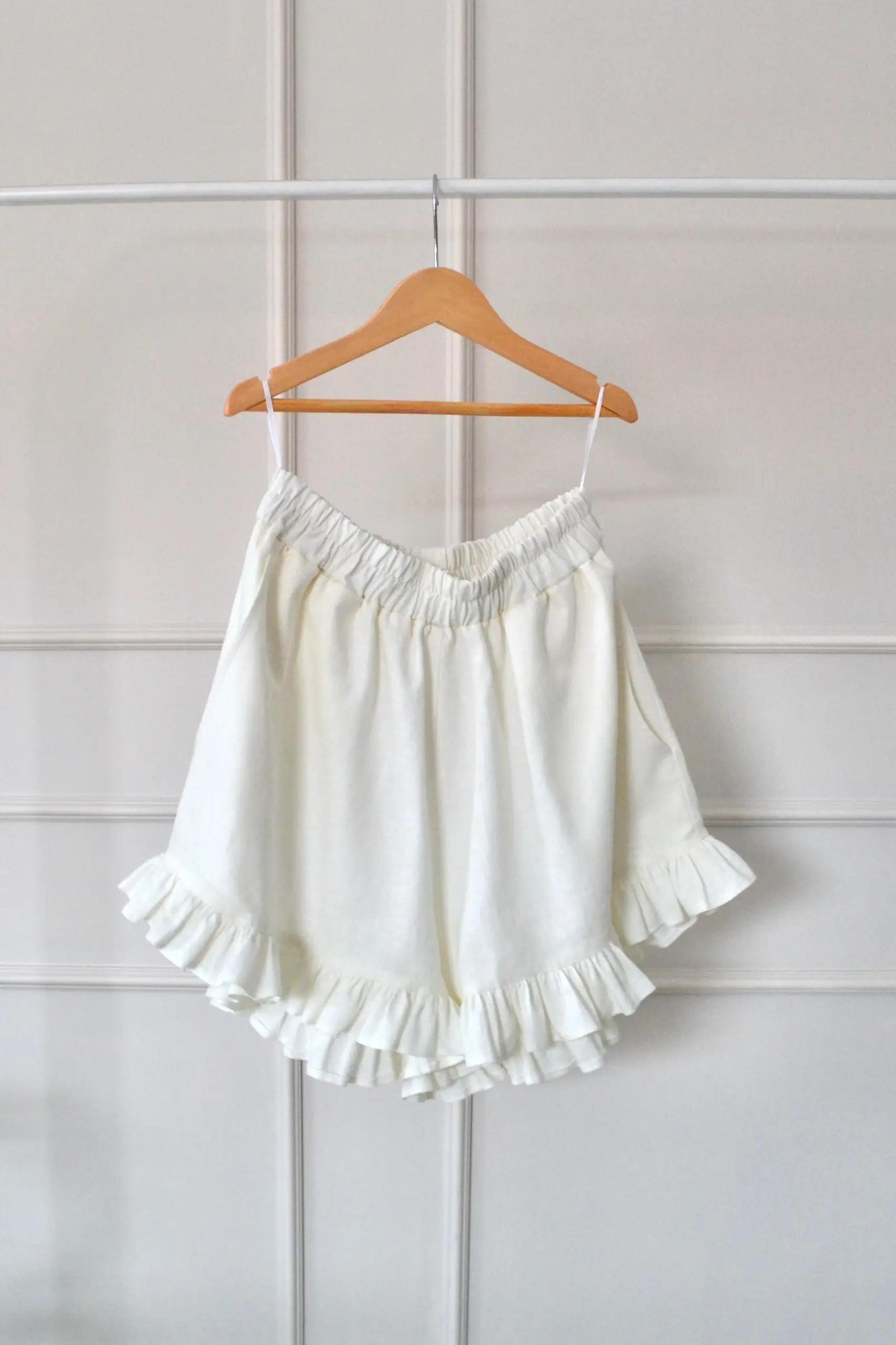 Falbanki wykańczające dół szortów nadają im romantycznego charakteru, łącząc prostotę formy z subtelnym detalem. To ponadczasowy element garderoby, który pięknie odnajduje się zarówno w domowym zaciszu, jak i podczas letnich spacerów czy spotkań z bliskimi. W zależności od dodatków mogą być noszone również w chłodniejsze dni. Zestawione z ciepłymi warstwami, kozakami czy botkami, zachowują swój elegancki charakter przez cały rok.
