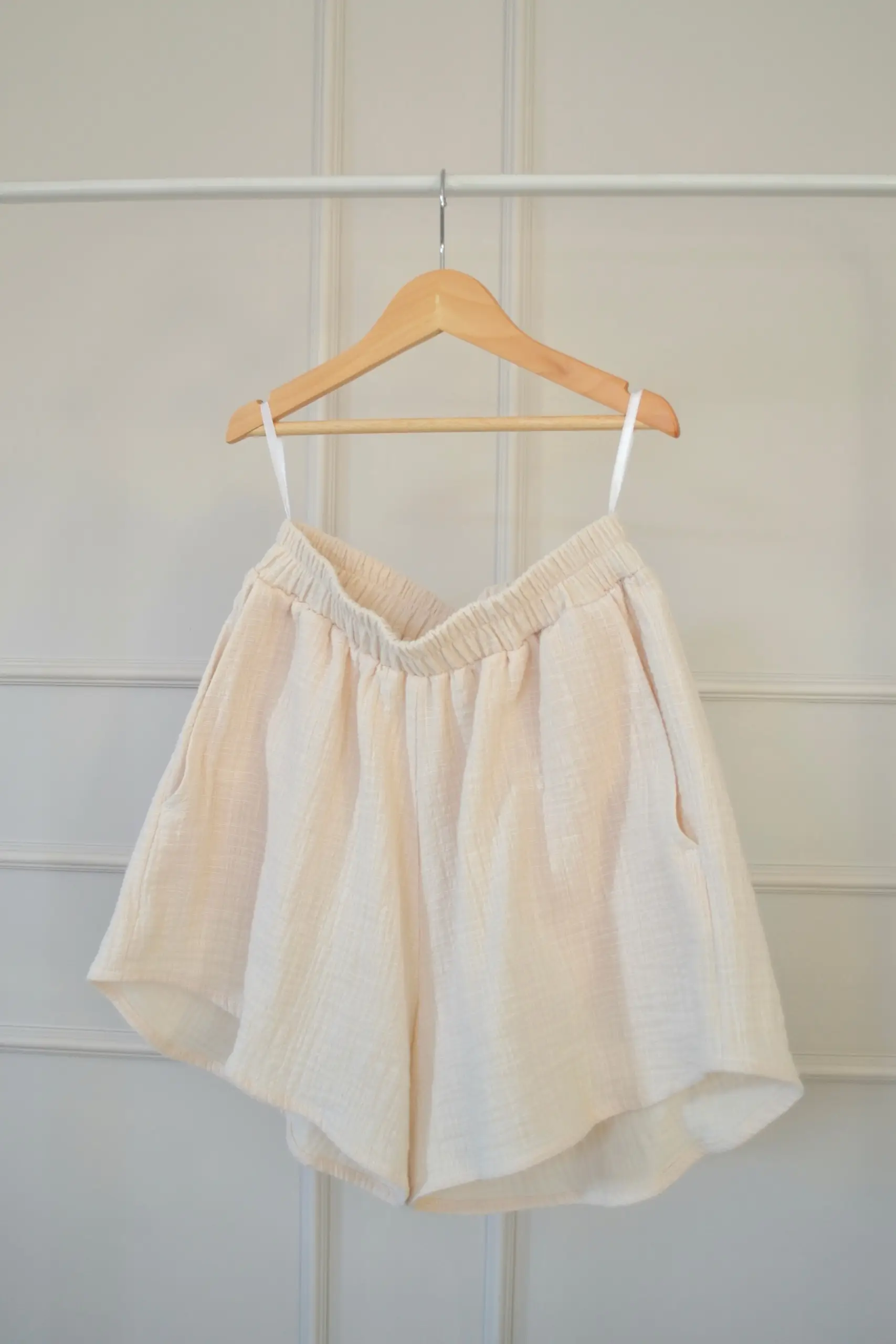 Muślinowe szorty uszyte z naturalnego, bawełnianego muślinu z efektem lnu. Miękkie i przyjemne w dotyku, zapewniają komfort noszenia i swobodę ruchu.