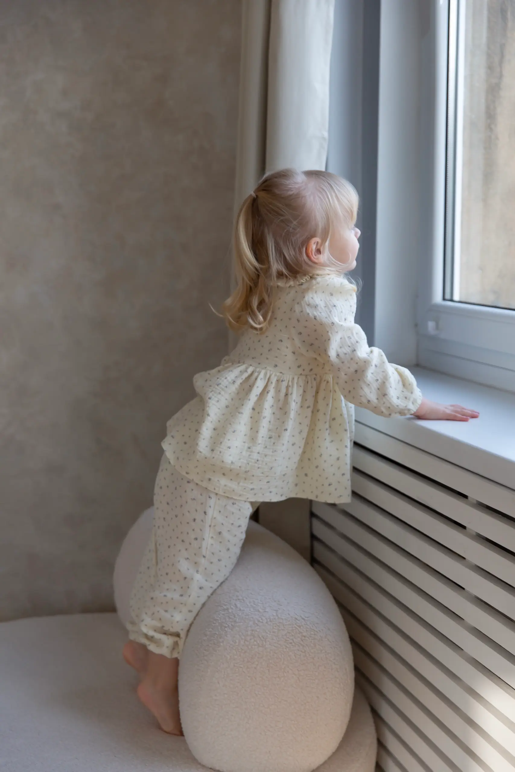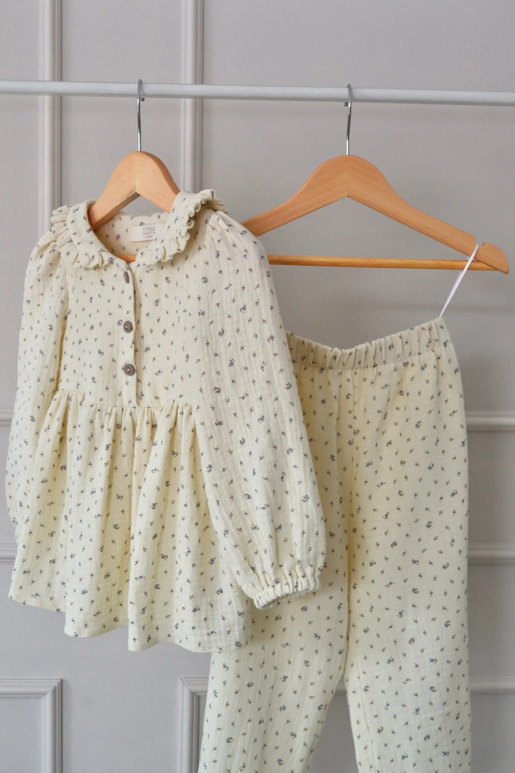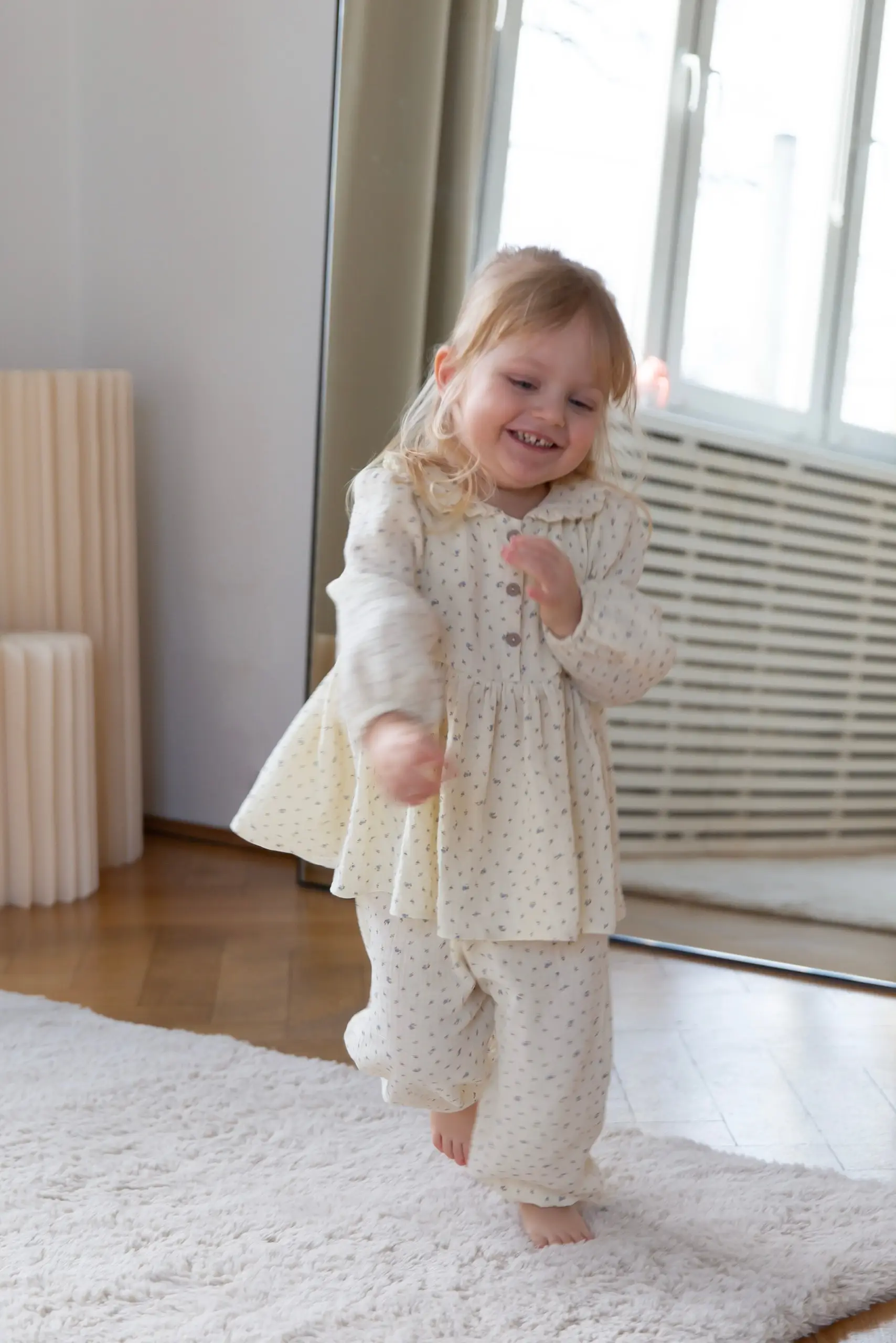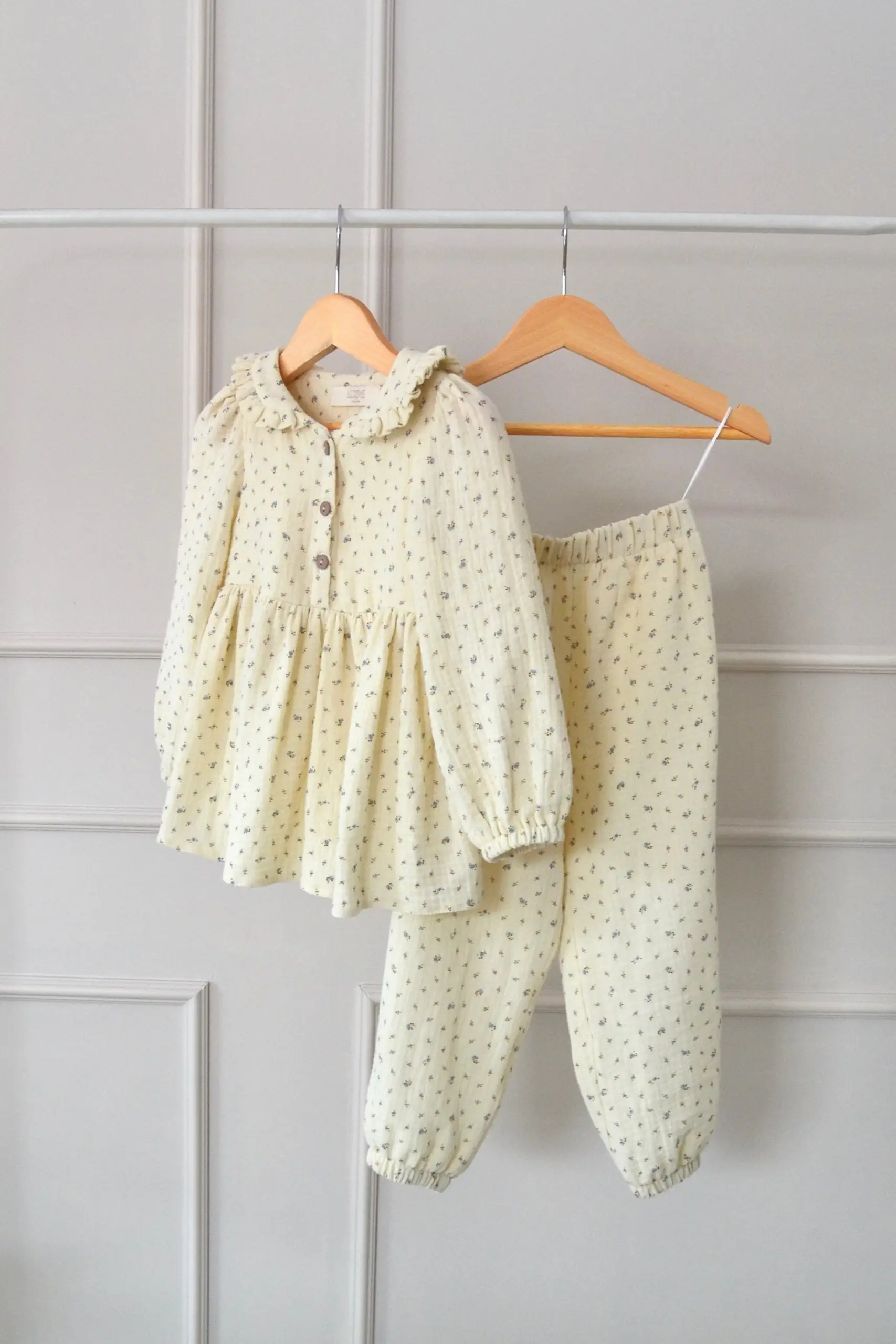 Uroczy i wygodny muślinowy komplet dla dziewczynki, składający się z bluzki i spodni, zaprojektowany z myślą o codziennym komforcie i naturalnej lekkości. W swojej subtelności zachwyca prostotą i ponadczasowym charakterem, sprawdzając się pięknie na każdą okazję. Komplet uszyty został z certyfikowanego bawełnianego muślinu, wyjątkowo miękkiego i przyjemnego w dotyku. Wzór w drobne kwiatuszki subtelnie podkreśla jego uroczy, dziewczęcy charakter.
