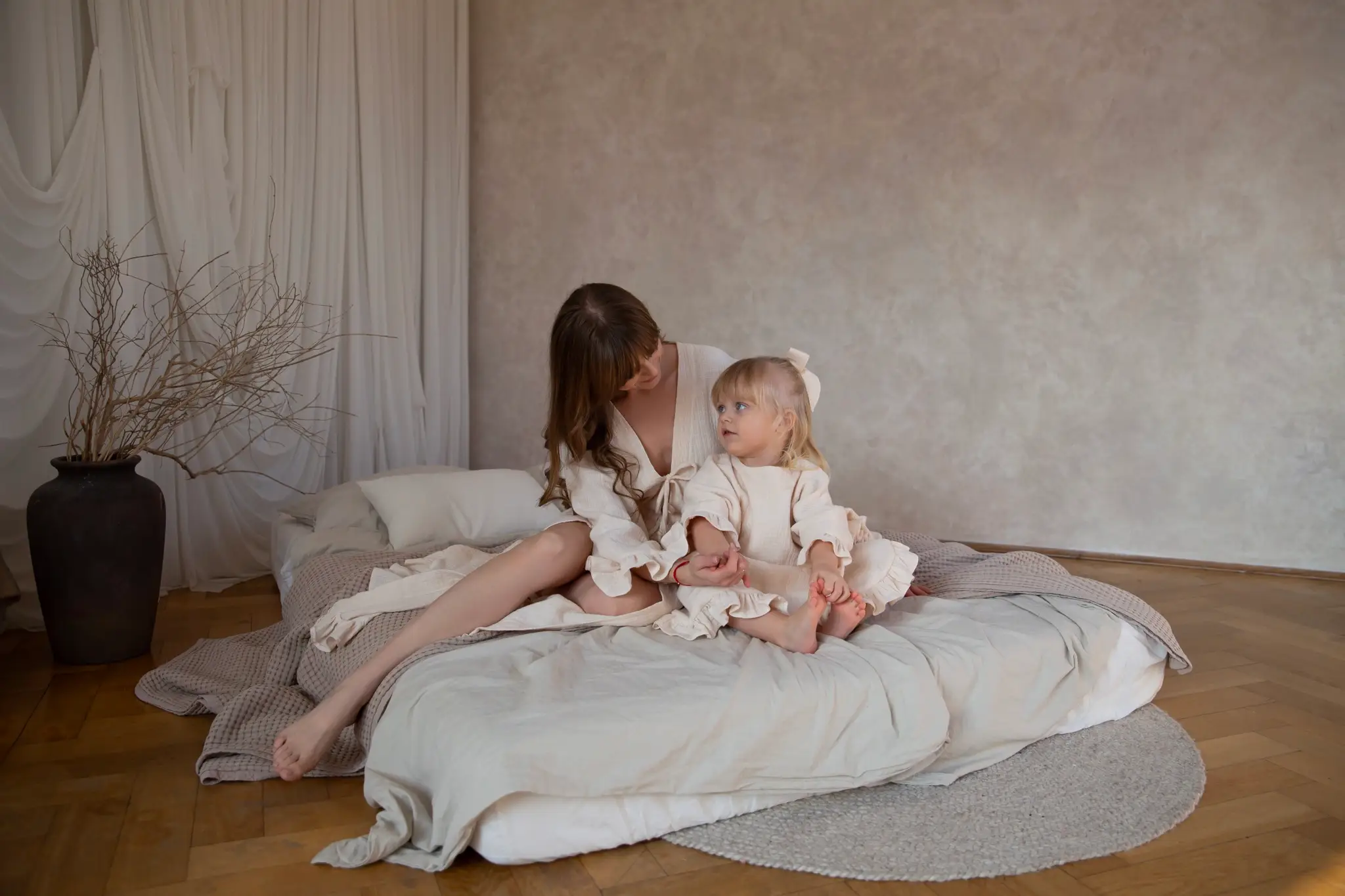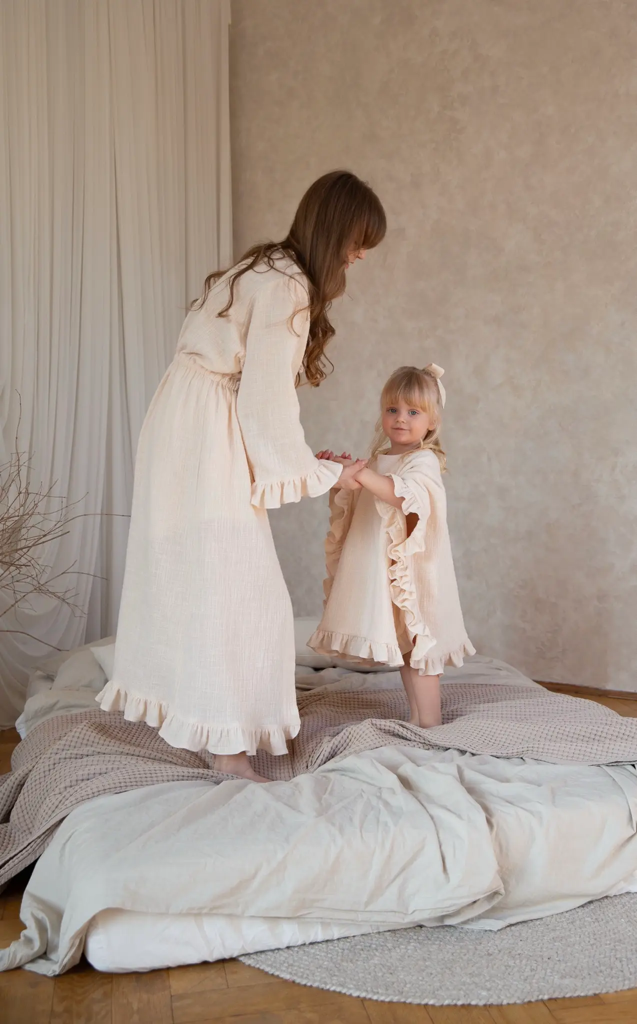 Szlafrok pięknie prezentuje się zarówno na żywo, jak i na zdjęciach, zachowując swoją miękkość i naturalną lekkość. W zestawie z muślinowym szlafrokiem dla mamy tworzy coś wyjątkowego, subtelną opowieść o bliskości, czułości i wspólnie spędzonych chwilach.Do kompletu można dokupić muślinową kokardę do włosów, tworząc spójną i wyjątkowo delikatną stylizację.
