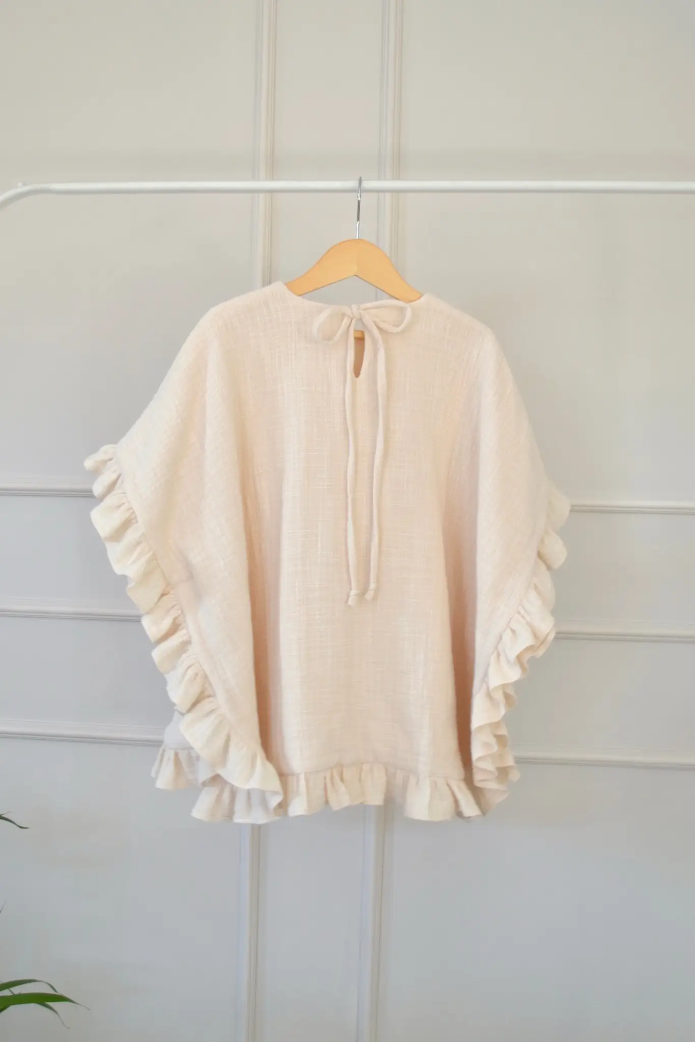 Wiązany z tyłu na delikatne troczki, łatwo dopasowuje się do sylwetki i codziennych potrzeb. Całoroczny i uniwersalny, idealny od chwili w domowym zaciszu, po kąpiel, a także jako lekki element podczas letniego plażowania.