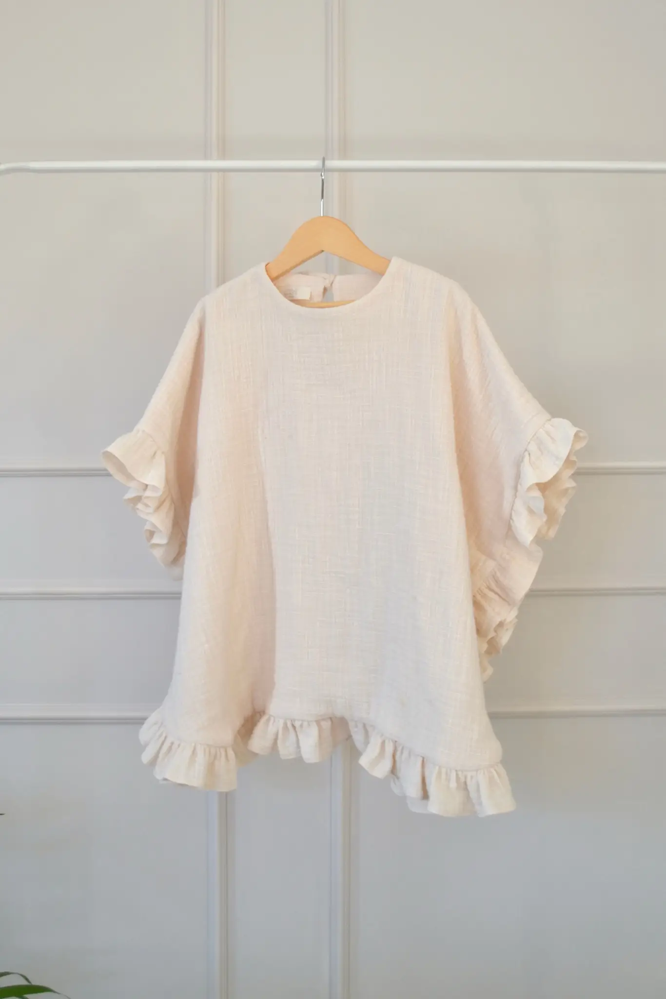 Delikatny muślinowy szlafrok dziecięcy, uszyty z naturalnej miękkiej certyfikowanej bawełny z efektem lnu. Wykończony subtelnymi falbankami, zachwyca lekkością i ponadczasową formą. Luźny krój zapewnia swobodę ruchu i komfort noszenia, pozwalając szlafrokowi towarzyszyć dziecku przez dłuższy czas.