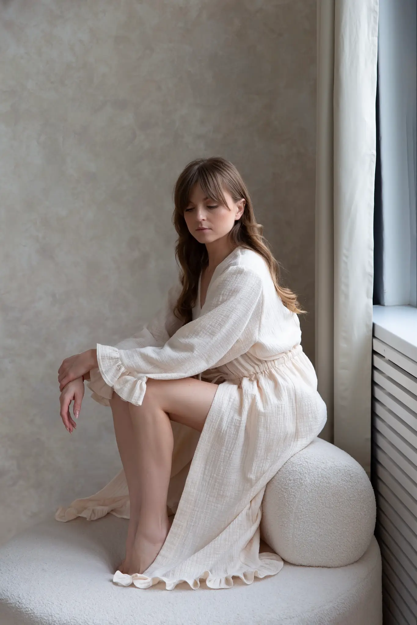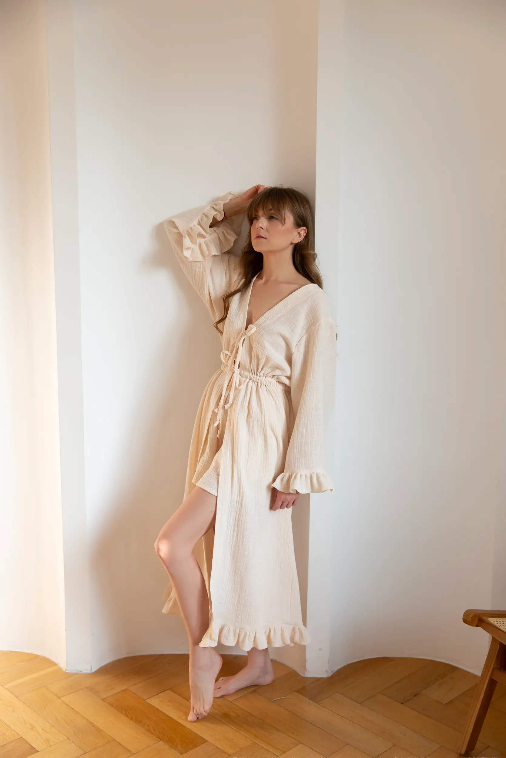 Damski szlafrok uszyty z naturalnego bawełnianego muślinu z subtelnym efektem lnu. Wiązany z przodu na miękkie troczki, pięknie układa się na sylwetce, podkreślając jej naturalną linię. Rękawy oraz dół szlafroka wykończone zostały lekkimi falbankami, które nadają całości romantycznego, kobiecego charakteru. To połączenie elegancji, miękkości i komfortu. Szlafrok jest przyjemny w dotyku i otula ciało delikatnością.